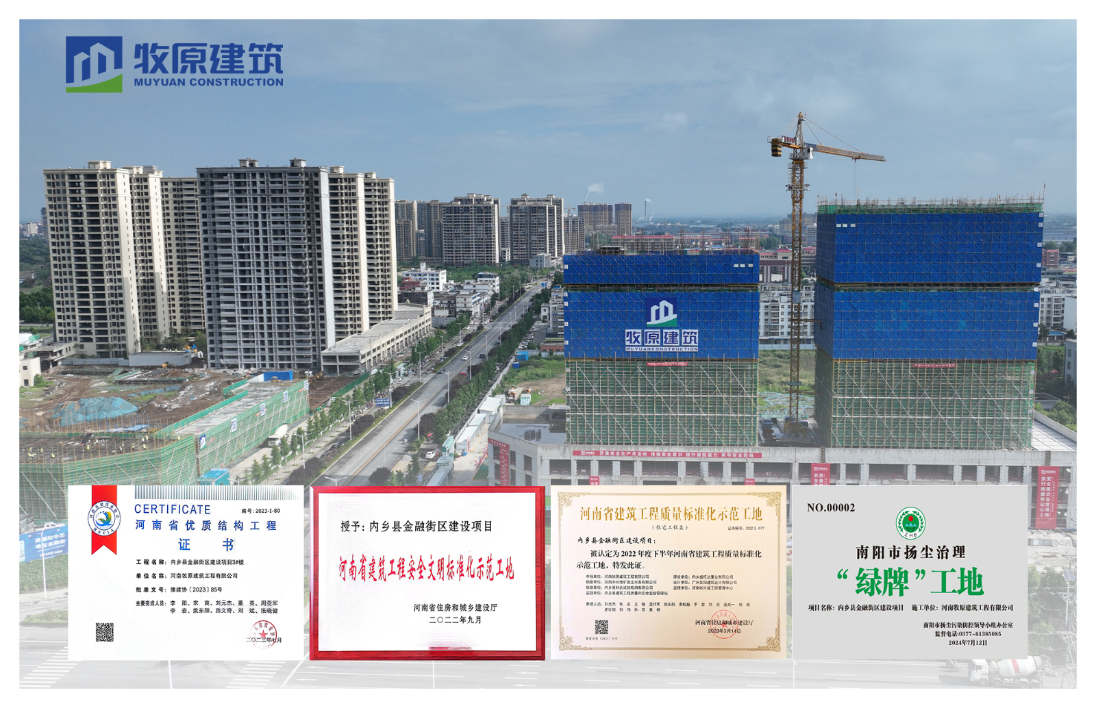 上下一心齊攻堅,同心奮戰(zhàn)保交期。在整個施工過程中,金融街項目部以交付節(jié)點為期限,倒排工期,細化建設(shè)任務(wù),從安全、生產(chǎn)等各條線組建攻堅隊,將人、材、機資源配備精確到每一天、每一個工作面,滿足每個供貨節(jié)點,確保項目安全、質(zhì)量、工期協(xié)同進行。為確保完美交付標準,項目部嚴抓工程質(zhì)量、嚴控原材料進場品質(zhì)、嚴格執(zhí)行施工工序技術(shù)交底,堅決執(zhí)行好各項工藝驗收標準,贏得了業(yè)主和行業(yè)的一致認可。在金融街項目建設(shè)過程中,牧原建筑先后獲得河南省優(yōu)質(zhì)結(jié)構(gòu)工程、河南省建筑工程質(zhì)量標準化示范工地、河南省建筑工程安全文明標準化示范工地、南陽市揚塵治理“綠牌”工地等榮譽資質(zhì)。