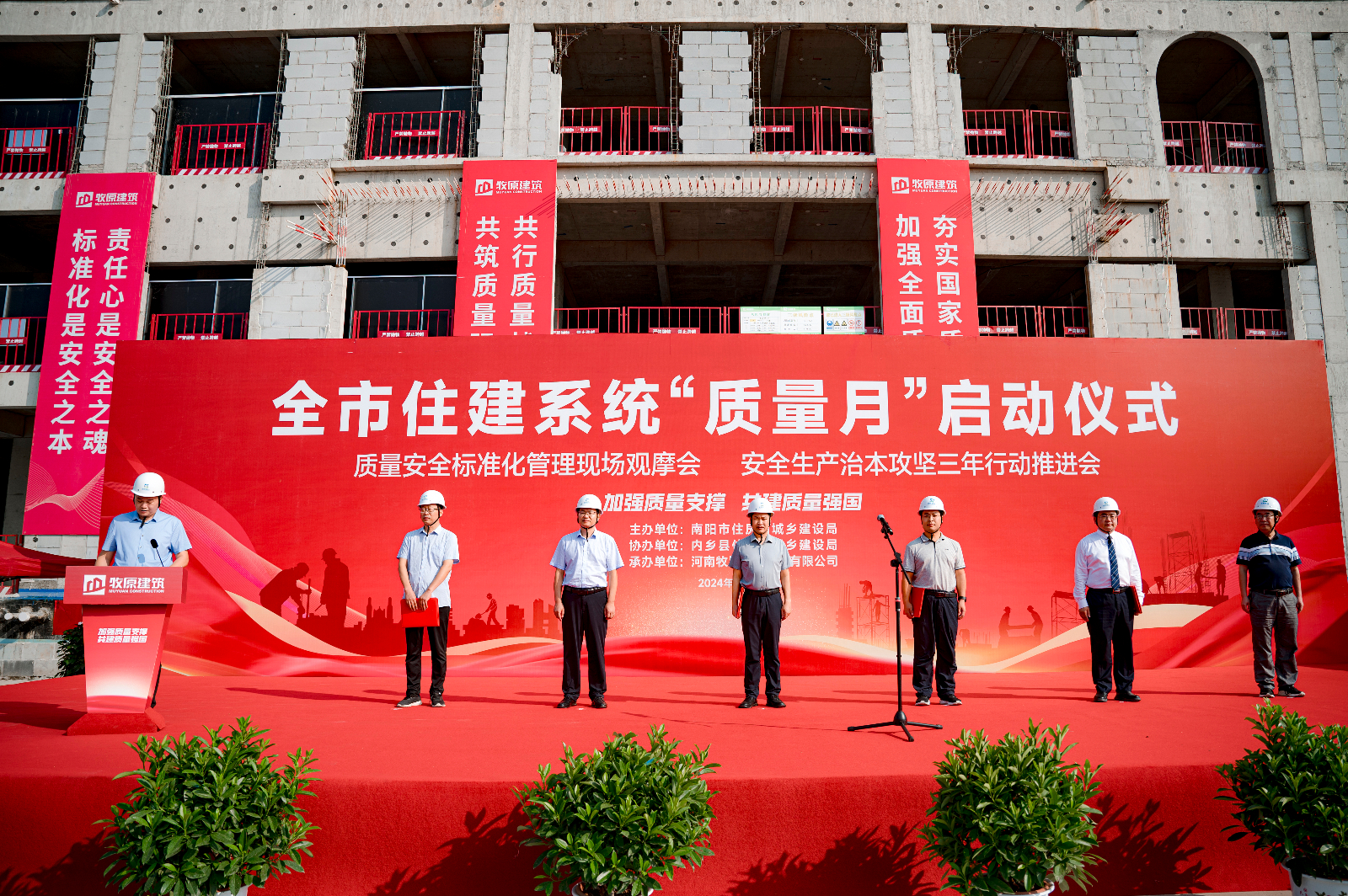 9月10日,南陽市住建系統(tǒng)“質(zhì)量月”啟動暨質(zhì)量安全標準化管理現(xiàn)場觀摩會、安全生產(chǎn)治本攻堅三年行動推進會在內(nèi)鄉(xiāng)縣金融街區(qū)建設項目現(xiàn)場舉行。市住建局黨組成員、副局長張紹鐸出席并宣布活動正式啟動,內(nèi)鄉(xiāng)縣委常委、副縣長張凱,內(nèi)鄉(xiāng)縣住建局局長黃橙紅,河南牧原建筑工程有限公司總經(jīng)理薄光永等參加活動。